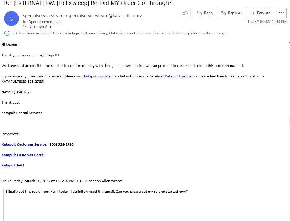 I immediately contacted Katapult. They told me I needed to get confirmation from Helix that there was no order. Naturally, I immediately reached out to Helix by email because that's the only method available if you don't have an order number (which I didn't have because there was no order).