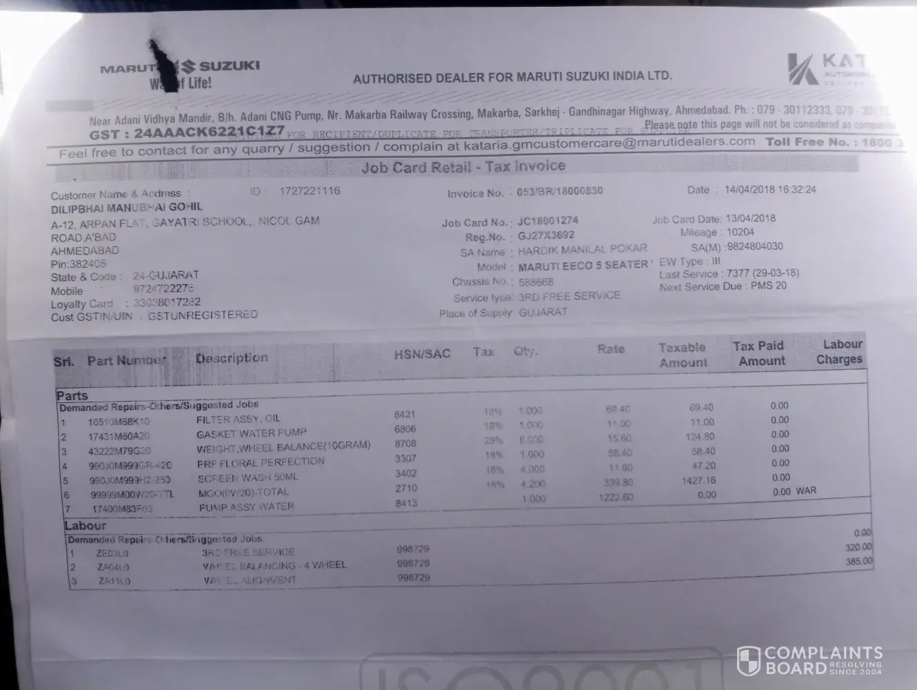 service with Kataria Automobile Athal, Silvassa, against Insuarnce claim. Total