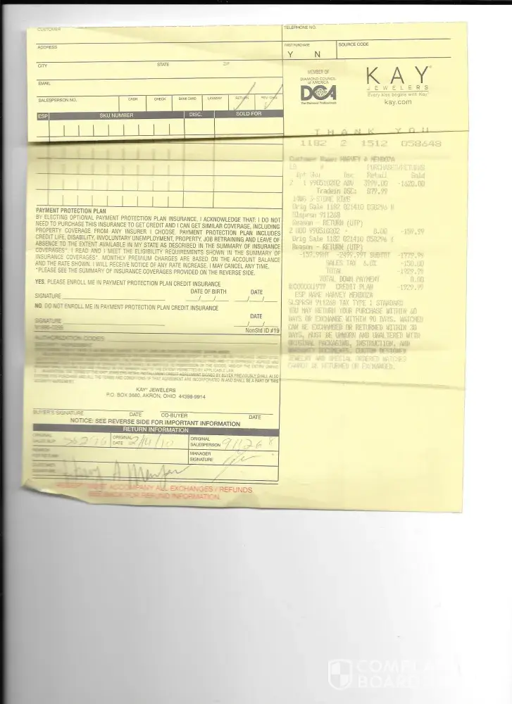 I have gotten many gifts over the years from my beloved husband. My 15 year anniversary is Dec 3 and I was going to trade in my engagement ring for a much bigger stone of 2 ct. I went to the store on Princeton Rd. On Nov 13 and picked out the ring I wanted I then call my husband to ask if I can put it on his Kays card. after saying yes I asked the sales person to do so. The lady asked for my husbands complete SSN and my yearly income I gave it to her thinking she needed the information to pull up my husband information to make the purchase. She pulled up his old information from when the card was original opened. The computer said that my husband card is under review and I left confused.