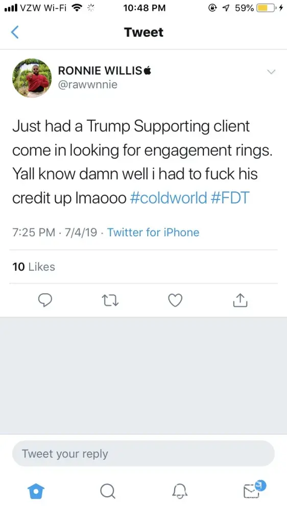 Employee Ronnie Willis, blatantly discriminated against paying customers. He not only takes his own hate out on on innocent people's wallets he the brags about it online on social media platforms such as twitter and Instagram. If this is the kind of employees that Kay Jewelers chooses to higher, then I will make it a point to never spend a dollar at any of...