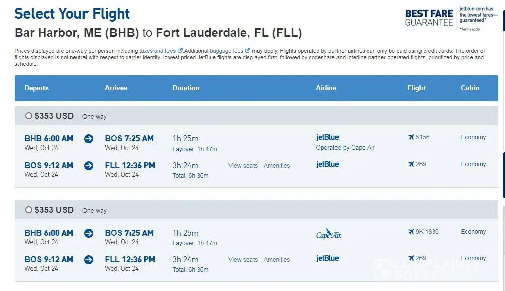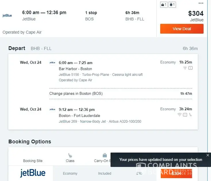 I did a search on kayak for a one-way flight from Bar Harbor, Maine to Fort Lauderdale. Kayak listed a flight flight of $274 using Cape Air and JetBlue. Above the search results in the fee assistant box, I did a plus one of a carry-on and a plus one of a checked bag. When you add or remove a bag in the fee assistant you will see a pop up that says Prices have updated based on your selection. when I added the checked bag the fare then changed to $304, which reflects the bag fee. When you select the flight details it says "You Pay $304" When you click to purchase the deal you are then redirected to the JetBlue site and the fare is now $353 and doesn't include the $30 bag fee. I did the chat with the Kayak help desk. I provided screen captures along with the details above and they said that the $304 is only valid when you book the flight. I explained that's what I was trying to do. I was then told that fare is no longer available and it will take approx. 2 min to update. I was receiving that fare info 20 min prior to reaching out to their support people because the redirect and higher fare didn't make sense. Yes fares change and I get that and know it well as I travel 75% yearly with my job.