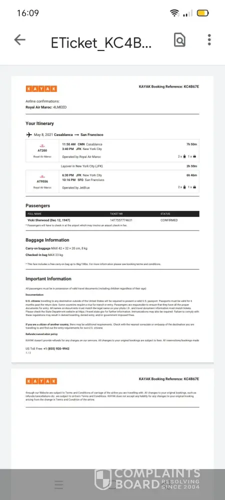 I bought my ticket CMN to SFO on Kayak.com.Said customer service from Kayak..I called them because at no point was there a place to indicate handicap assistance needed..or to tell them I am traveling with my own wheelchair. when I called Kayak customer service. (expensive international call)