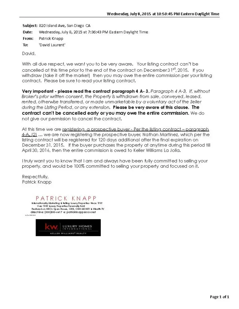 This is exactly what happened with us. Only Keller Williams and their broker in La Jolla is complicit. We even got the same email. It is laughable that this is the way he does business. We wasted a year with this joke of a realtor. Never showed the house to his office Coldwell Banker, Newport Beach (at the time), never asked anyone to come look at the house. Kept asking me to show my own house without any representation. Didn't respond to questions, comments, requests. We had to do some work on the house and asked him to take it off the market, he refused, finally after a week of asking, we told him to just cancel the listing. He thought we were going around him. He sent the same email as above and excluded a realtor and an entire office. I agree with everything you said, everything and more. He even left the CB office in NPB and went to KW in La Jolla with our listing in hand. Never told us, never asked us, we found out ourselves. CB cancelled the listing in May so we are free to do as we please, Both offices are complicit and responsible for this farce. What a joke.