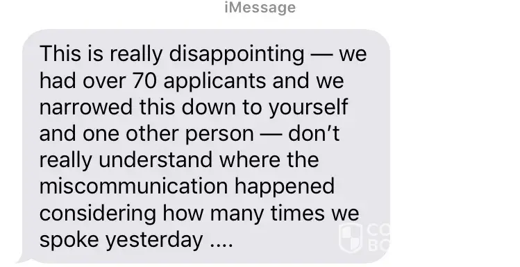 " This is really disappointing — we had over 70 applicants and we narrowed this down to yourself and one other person — don't really understand where the miscommunication happened considering how many times we spoke yesterday ..."