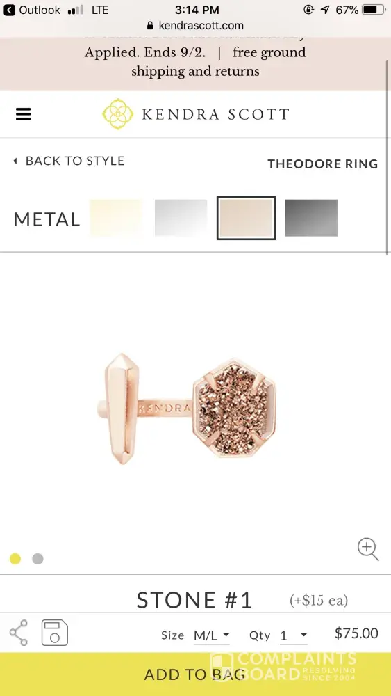I received an email addressed in my personal name offering me Get15 ($15) plus 25% off sterling silver, fine jewelry, and the men's collection. And 30% off everything else. When I got to the counter, they said "oh this particular men's bracelet doesn't apply." I showed them the letter I received and she pointed to print at the bottom at my age would need a magnifying glass. And it didn't list the exclusions. I have had so much admiration for Kendra Scott, but now feel people are being deceived or manipulated. I took a day to drive and face the traffic and parking for a specific item and then got roadblocked at checkout. I appreciate you listening to my disappointment. All these years I have never had a bad experience until today.