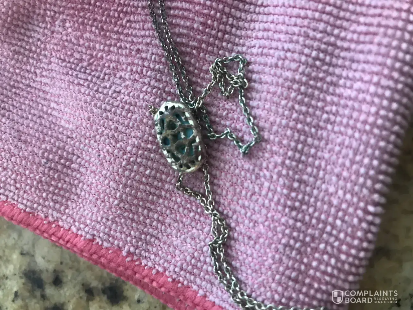 My daughter purchased this Kendra Scott necklace for me last year as a birthday present and I started noticing the "rusting", tarnishing of the chain and back of the stone setting. It has gotten worse over the last couple weeks. I don't wear lotion around my neck or spray perfumes on it. I do not sleep in it or shower with it. It has caused my neck to itch...