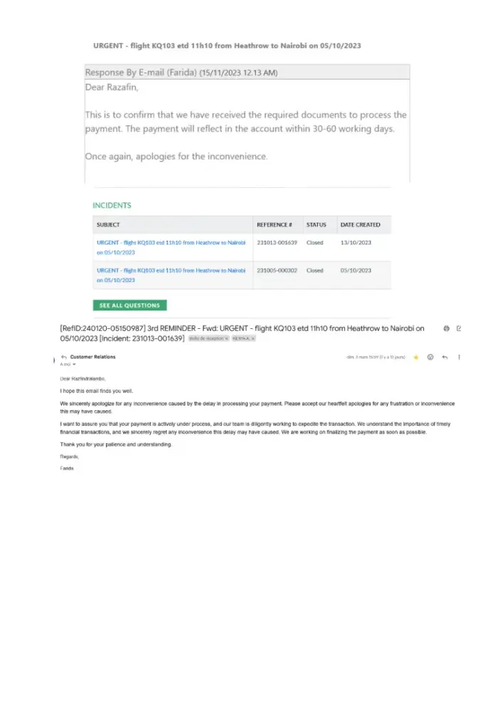 - 03 Mar 2024 at last new email from KQ pretending excuse and announced « payment is actively under process »