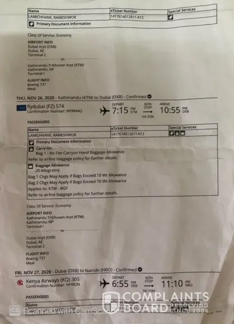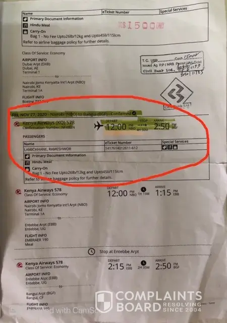 I am working in MINUSCA, Central African Republic. I had a roundtrip ticket from Bangui to Kathmandu and back. According to the itinerary I was given, I boarded from TIA (Kathmandu) to Dubai and landed Dubai at 1145 PM on 26 Nov. Then I reported to the transfer desk at Dubai for Q 305 next connecting flight. Since that was bit early, I was advised in the transfer desk report 3 hrs in advance of departure of flight, i.e. 0400 AM on 27 Nov. But when I reported back, they refused to board me for KQ 305 saying that I would not make to the connecting flight from Nirobi to Bangui. When I explained to them that my flight according to the ticket I was given, KQ 578 was scheduled to depart at 1200 PM and there is no reason that I would miss it. Then I was told that the flight was cancelled for unexplained reasons. Now, I have few concerns which I hope your esteemed airlines will address.