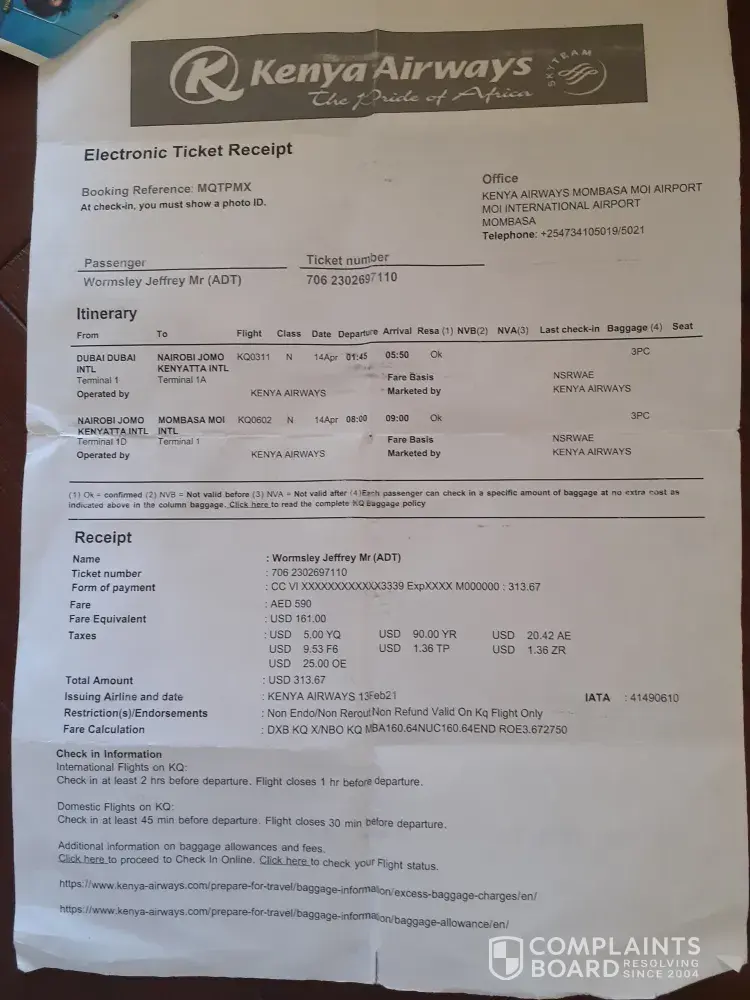 OK, my first complaint is nearly three years old and l still have no answers from you. I booked via my debit card two tickets to fly from Mombasa to London Heathrow for a Christmas family gathering, one ticket for myself and one for Mrs Franca Marino. Unfortunately, one member was taken seriously ill and we had to cancel our flight. I understand that you have to charge a cancellation fee, which l was told was 20%. When l received my refund you had taken in the region of 43% l never got an answer as to why the difference.
