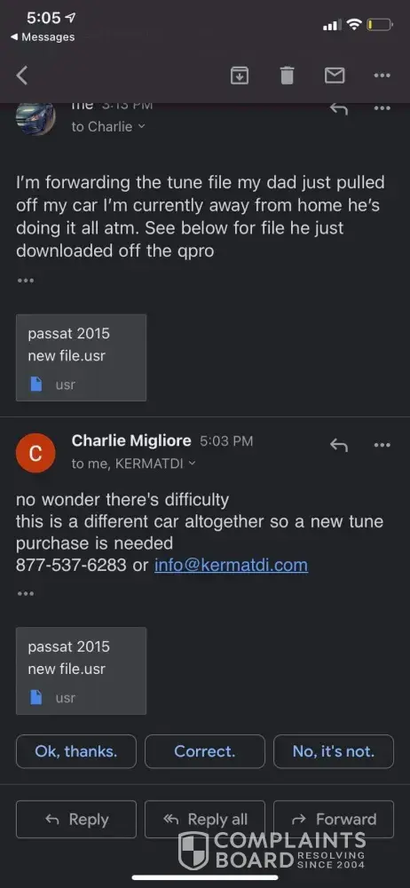 My Son buy Qpro+ form Kermatdi pay 1000$ canadian and after Tuning engine was destroyed, i bought another engine and ecu from the passat and it was installed on the car, when my son contacted kermatdi customer service he replied Charlie Migliore, he was told what happened and the answer was, so a new tune purchase is needed, in the advertising from kermatdi NEW Q-PRO TDI FLASH TUNING FOR 2015-** JETTA, GLOLF, BEETLE, PASSAT, SPORTWAGEN, , i called kermatdi and i talked to someone there i explained the situation and CHARLIE TOLD NOT DO ANYTHING WITH MY FILE, i am disgusting why it happenned, that`s why i`m going to return Qpro+, kermatdi has false advertising and disgusting customer service, i recomand stay away to kermatdi