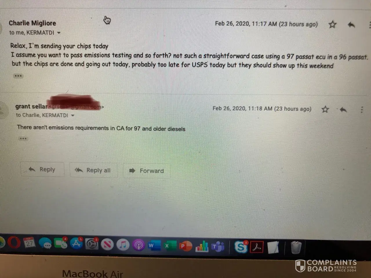 I call their office, Mike answers, is very attentive and helpful, and instructs me to send an email to the tuner. I construct a professional step by step email and he responds 'there could be a problem with the chips? Oh really? I ignore that and answer his subsequent questions about smoke etc I even send him the fault codes (the replacement ECU was from a 97 FA ECU whereas my original is a 96 GQ) -txt file from VCDS to help the process. 15 emails go back and forth before the communication stops. I wait a week with no response I send an email to info@Kermatdi.com explains that I now have a substantiated complaint about this process as I am $180 + $125 + $325 in the hole without having actually received anything.