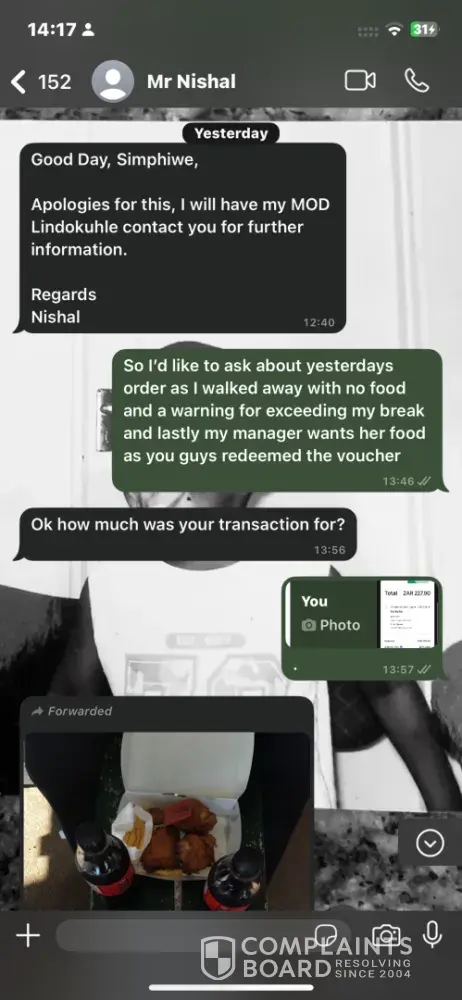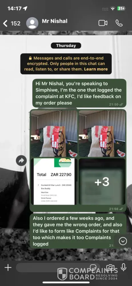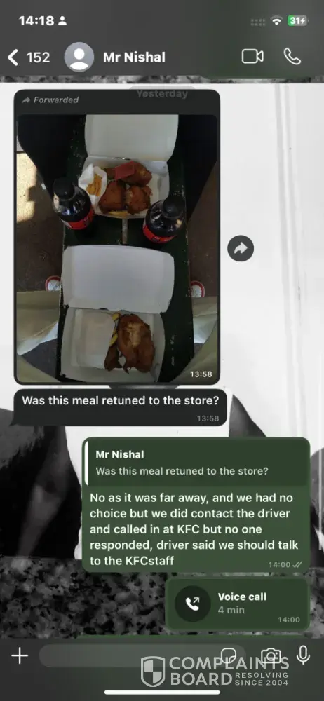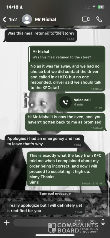 I ordered 2 ordered 2 Dunked all star lunch box buddy, and I was given 2 streetwise 3, which were oddly very cold, I ordered it via uber eats I couldn’t return it cause we were far away, I called the driver, he said I should call in at the store, so I did, called 3 times they don’t answer. I then gave up and forgot about it, now I bought a KFC voucher and it was not rectified, I fought for my food and literally returned with nothing, spoke to the manager Nishal, promised to get back to me yesterday evening and never did, it has been 4 days already and nobody has gotten back to me. Is this the type of service KFC gives out to their customers, I will be escalating this higher up if nobody gets back to me by tuesday.
