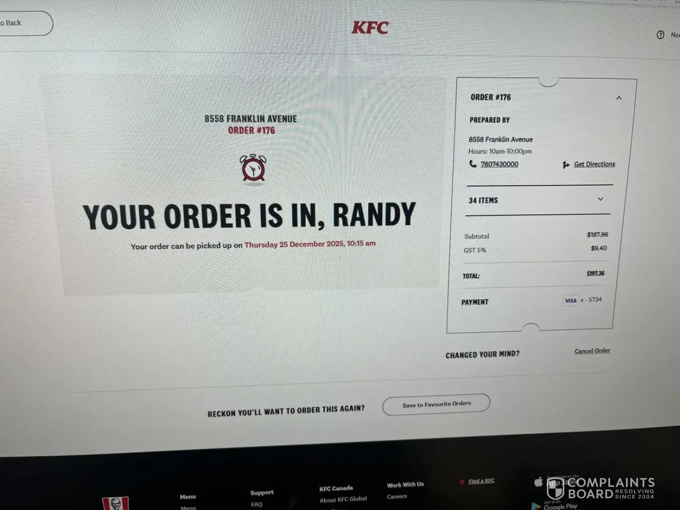 Read full complaintOrder placed in advance for Christmas day. Pre-paid- Go for pickup and the store is closed