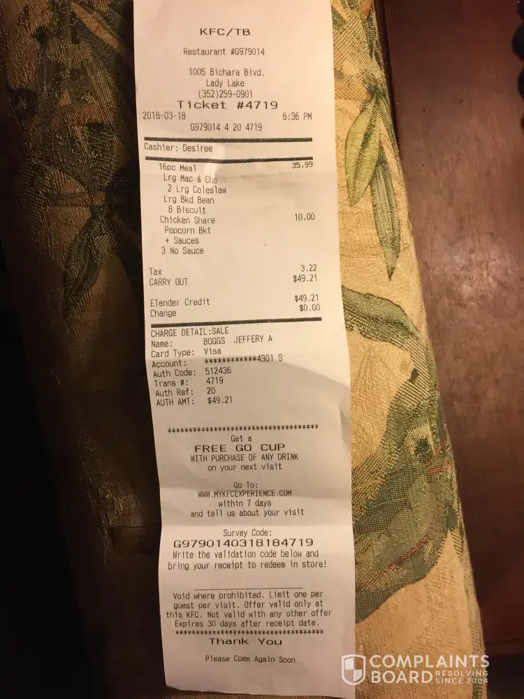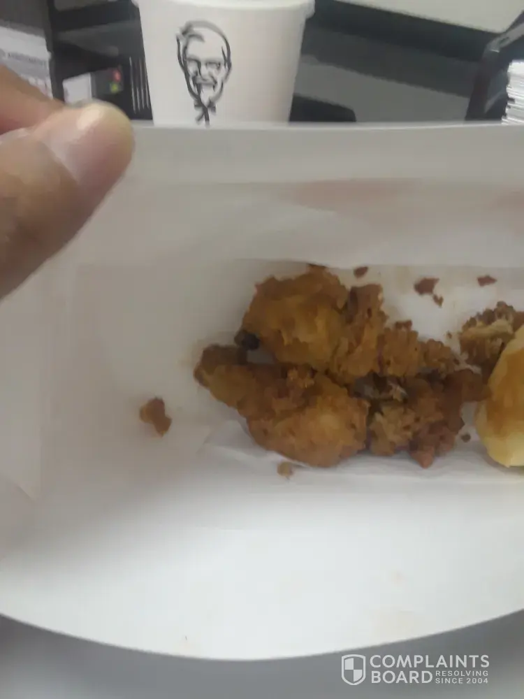 I went into a kfc restaurant where I usually go. I had the worse experience of my life. First of all i'm a counselor and I work children 24/7 all day everyday. I went into kfc and was purchasing chicken along with biscuits macaroni etc... The lady at the front register had the worst attitude ever like if I was bothering her. Second of all like I said I work with all children we usually go to church's and hang out there to keep them off the street. So I had my tax exempt she said they can't accept that every kfc I went into accepts it. I finally got my chicken after 1 hour of waiting. I look at all my food when I get home and this is how my biscuits look. Maybe because she had her son at work with her. While i'm trying to place my order her son is bothering her for something to drink. I called store manager and he said he will send me a coupon sort of thing to get my whole meal free. But when? It's going to be a month!. The store manager use to be remy and he was the nicest thing there always had the restaurant together. Store location is 6040 south archer chicago il 60638 my name is cecilia mannion