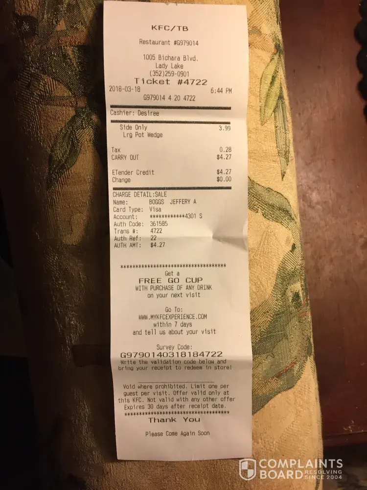 I purchased my product today from Kentucky Fried Chicken on 3rd street, in Chattanooga, Tennessee 37404 on 3/13/2018 at 2:00 P. M. The numbers on my receipt associated with the restaurant are K365008 2 192 1762. I purchased the Flavors of the sauce 3 piece hot chicken Tender Basket. It was sitting in so much oil, I poured it off and there was at least 1/8 of a cup of oil that it was floating in. The biscuit was wrapped in paper and it wasn't a biscuit but a roll. The oil got all over the paper the roll was wrapped in. Before I could eat it, I had to take a bowl and pour the oil off. It was still very oily and unappetizing, this can't be healthy for anyone buying this product. I won't ever purchase this particular item again. Below are pictures of the oil that my chicken was in, this is minus the oil that I had to blot from the chicken tenders with paper towels. This was a waste of money.