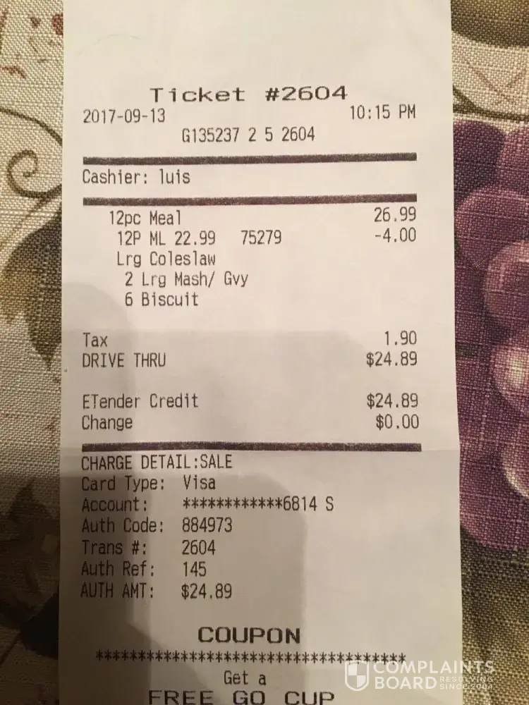 I order 12 pc original chicken with 6, bisquits, TWO larger Mash potatoes, 1 gravy, and 1 large coleslaw. The receipt is in the picture attached. The issue is they didn't put the other mashpotatos even tho they charge it. Plus the one they did put the container of the mash potatoes was rip from the bottom (sorry I didn't take a picture the kids started grabing some an made the container worse so i had to put it in a bowl) but, I saw this when I got home I live all the way to the south and wasn't gonna go back to the north an waste double the gas. Plus they where in such a hurry to get rid of me since they where close to closing for the day.