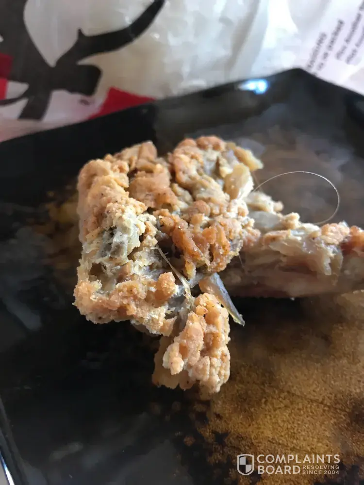 I placed my order to go. While eating, I was again grossed out, finding a piece of blond hair embedded in the chicken. I lost my appetite immediately and have not eaten at KFC since then.