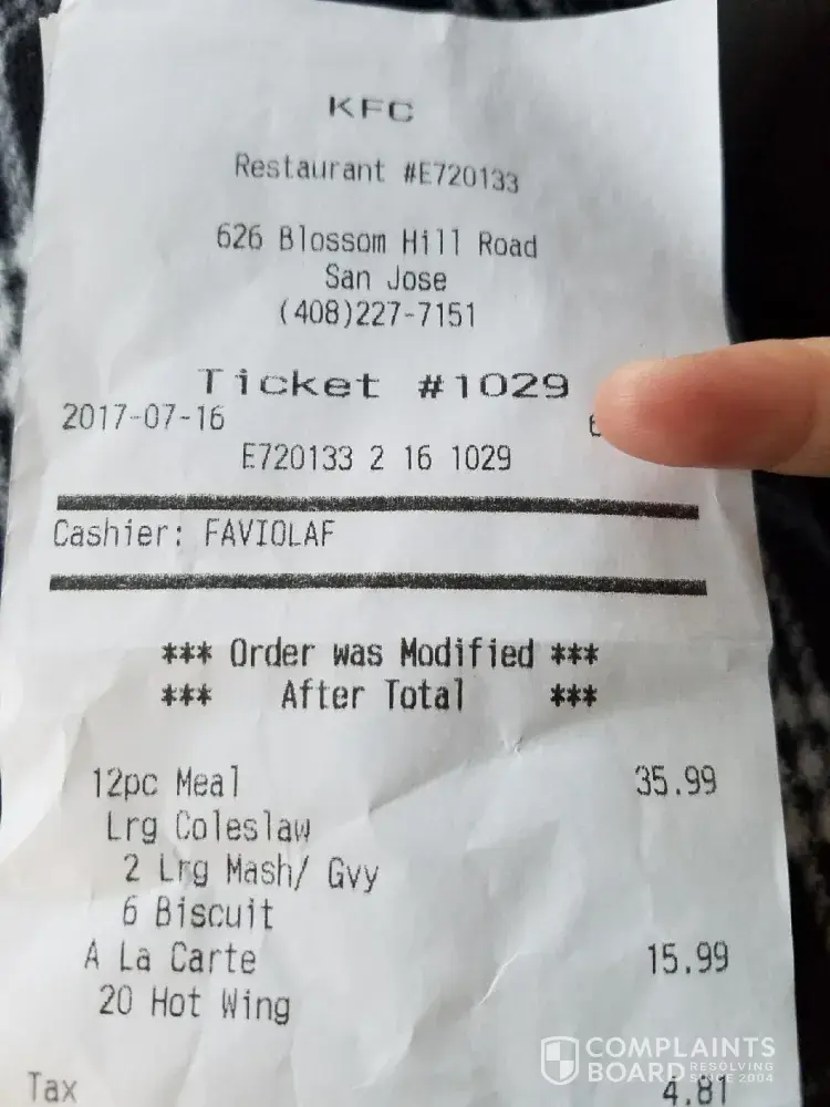 I visited our kfc 2720 keith st in cleveland, tn this evening. I ordered (2) $5 chicken tender boxes and a $20 fill up box. I paid with a credit card and signed what I thought was a receipt only later to find out from the manager (ann) that the piece of paper I signed was not a receipt. When I got home, approximately 7 min I noticed that there was only (1) $5 tender box and no cole slaw with the $20 fill up box. One of my children get their meal while I have to go back to kfc to get the other $5 box for my other child meanwhile my food is getting cold. When I arrive at kfc on keith st and let the same person working the drive thru (Alissa) that took my order of their mistake she asked me for my receipt. She never gave me a receipt when I received my order. I was told that there was nothing they could do without a receipt. I asked for the manager and that is when I found out that the piece of paper that I signed and the cashier put in her register was not a receipt again I was told that there was nothing they could do for me. I had to purchase another $5 tender box so I could feed my son. Oh yea and the cole slaw too bad. I do understand not all people are stand up people and you have to make a judgement call but I have a very nice vehicle and paid with a credit card so my time is more valuable than going through all this to steal $5 from kfc! Just saying. Please train your employees well enough to fill a simple 3 item order and if the cashier adds to the mistake please take some responsibility and own up to the mistakes that were made by your employees and make it right.