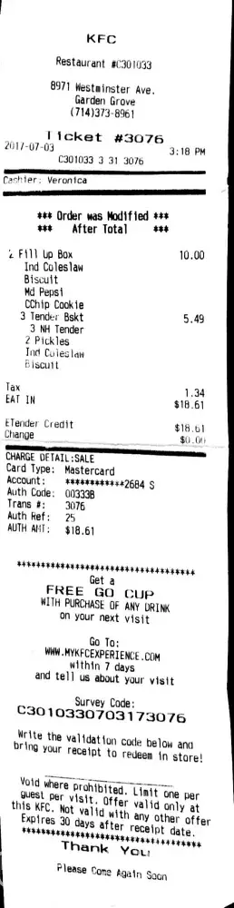 My hudsband and I always enjoyed KFC in past- however, this was the worst of worst & we did put in a survey with complaint, and did revieve a refund, however, when we walked in the same girl from previous visit was at counter smiling and asked us "you guys back for more?"we reponded - No - we are back to get a refund- then she just walked away from us - not even wondering why we were dissatisfied...nothing -Wow!