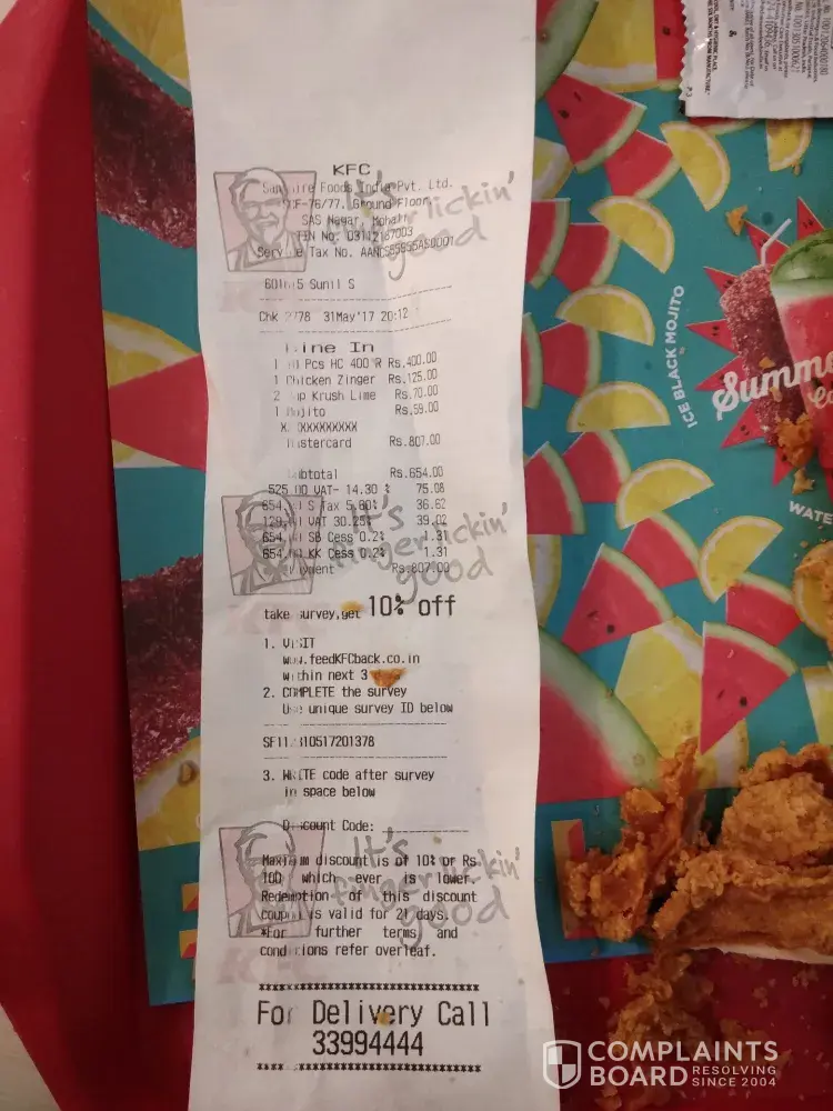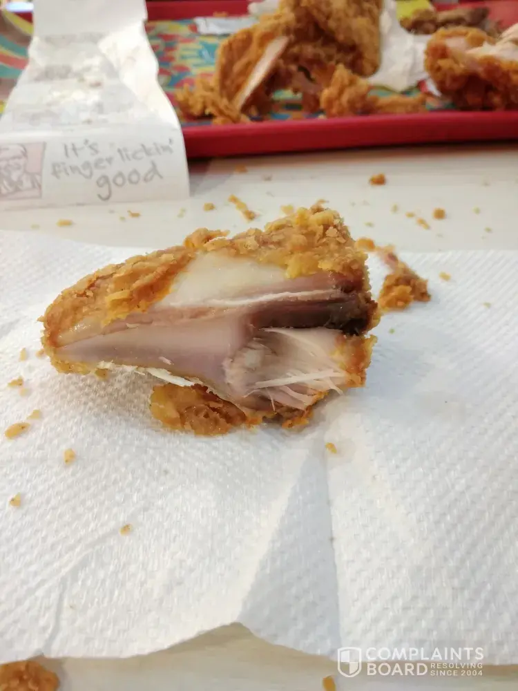 We had ordered 10 piece hot chicken bucket on 31st May, 2017, bill number 2778 at a local outlet of KFC. The quality of chicken they served us was not eatable because of several reasons. Firstly, chicken inside the fried coating was not chew-able as it was severely dry. Secondly, after the first bite, we observed that the bone of chicken was black in color. We were really shocked to see that bone color, it seemed like they have cooked a diseased chicken.