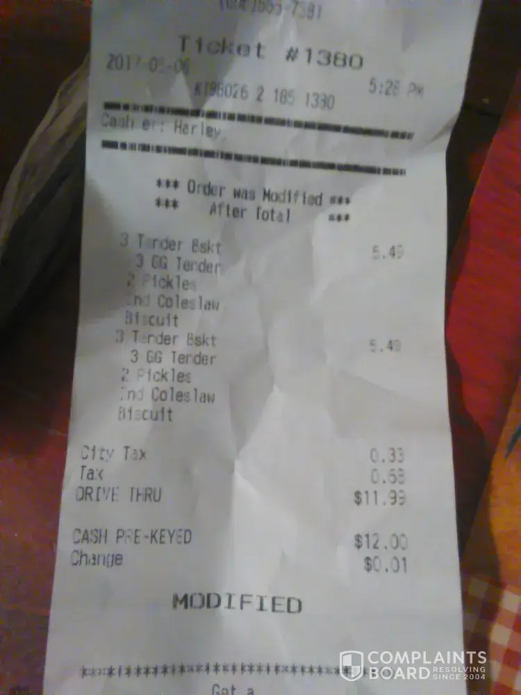 Visited KFC # K198026 @ 382 Hwy 15 North, Jackson, Ky. Ticket # 1380 date 5/6/17, time 5:28 PM. Cashier: Harley. By the way, Harley was very nice.