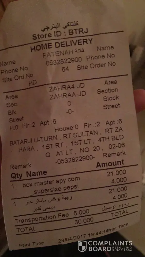 I did order from saudi arabia, jeddah, albatarji branch at 7:39 pm and I received my order at 9:05 pm... I called call center so many times but no one hepled everyone said the driver on his way sorry for being late... Although it's not the 1st time with this branch with same problem...