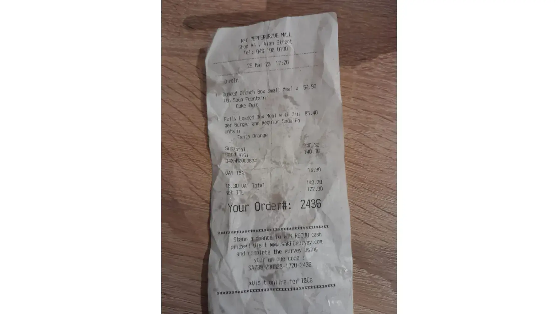 Good day. We bought a Dunked crunch meal and a Fully loaded Zinger box meal, dine in at KFC Peppergrove Mall Wednesday at 17h20 order number 2436. My chicken was missing in the dunked crunch meal and there was no salt, my husband went back and they gave the dryest centre breast ever and the salt was out of stock. No spoon with the mash and gravy given, so went back to ask for a spoon, only to realise that it was gravy only when back at the table. Had to go and change that again. Then bit into the Zinger to find out that it was a regular fillet. Imagine having to get up 4 times to go and correct mistakes that were made due to negligence and having to eat cold food. The service sucked and no amount of short staff or whatever excuses they made up could ever make this right. I had missing stuff in orders before, but this time it was simply too much not to complain. The service at KFC Peppergrove mall sucks and this is my last.
