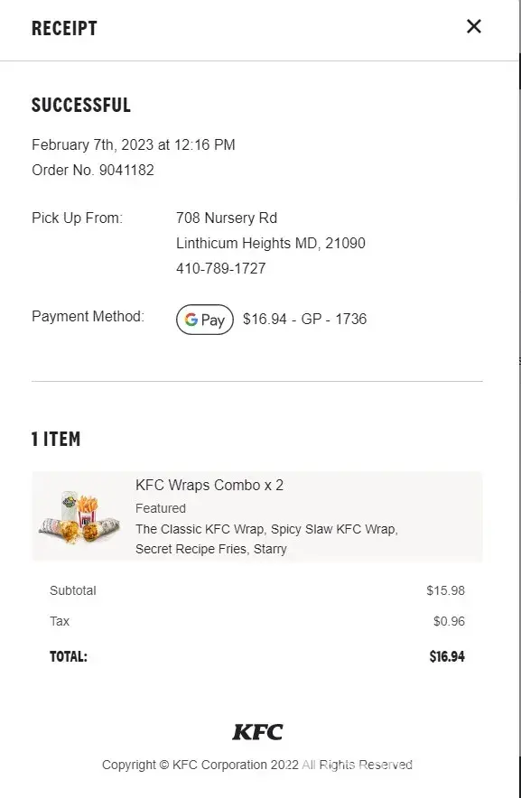 I placed an online order for pick up on 2/7/2023 @ 12:16pm for (2) KFC Wrap Combos. I sat in the store waiting for 30 minutes before I got my order only to find that it was incorrect and they had only given me (1) meal. I informed the manager on duty that I ordered (2) meals and her response was that only (1) came through on their system. I then told her...