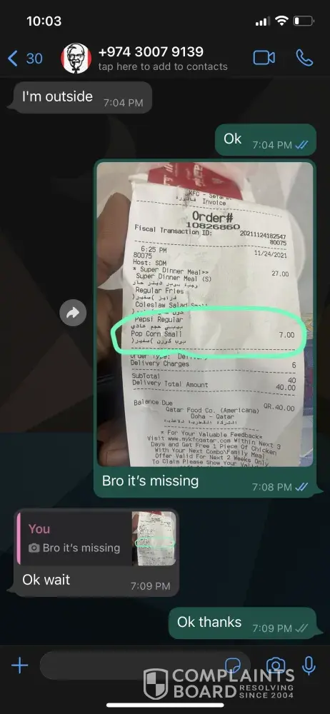 Today at 8:30 pm @ kfc ruwi muscat. Order number 36. Chicken pieces, srrips and fries were not fresh at all.