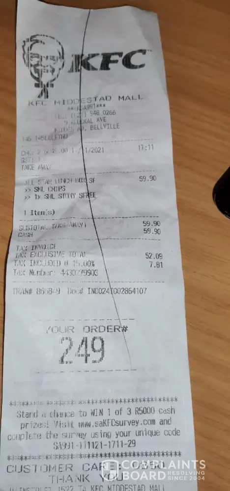 Yesterday I visitted KFC MIDDESTAD MALL to buy an allstar. Got a bad service I wrote a complaint on the kfcSurvey, they did not respond until now.