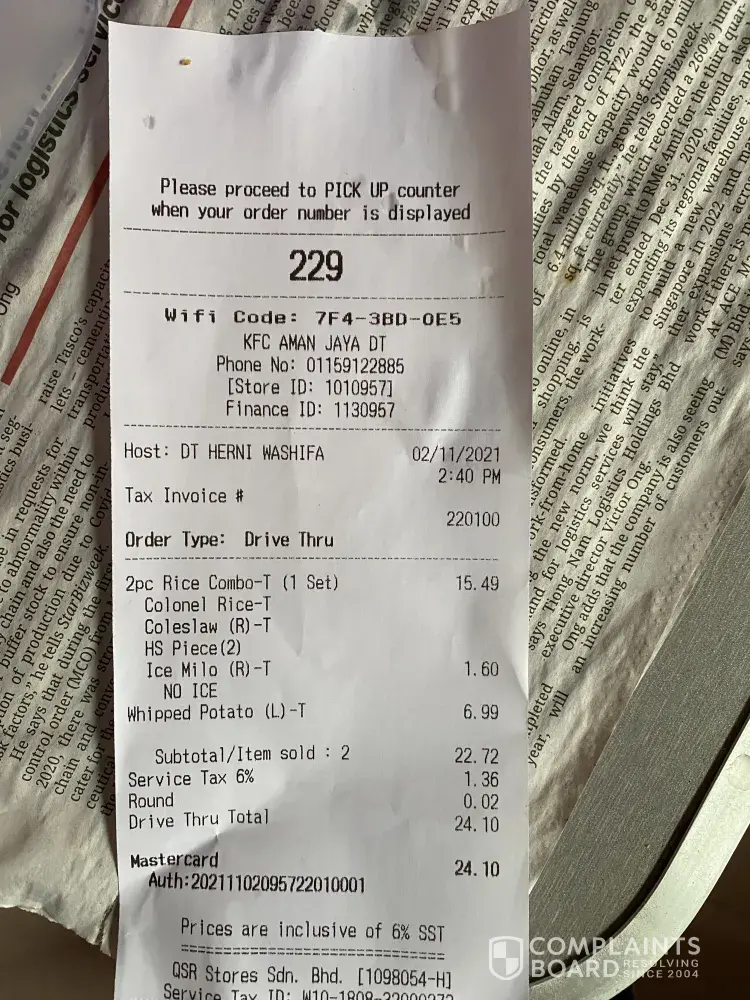 complaint this to KFC. She kept quiet. And after i receive the order, she ask me to move the vehicle as behind me there is another vehicle waiting. I said let it wait, it's my turn now and it is my rights to check