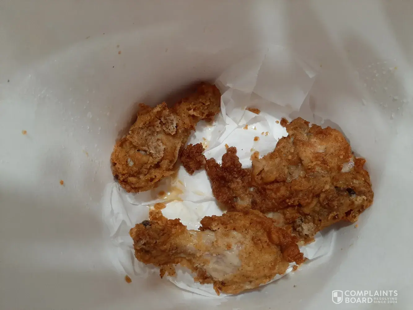 1. The first issue was we ordered (2) two buckets of chicken, but our ENTIRE order was stuffed into (1) one bucket. Which means everything to include the (2) Two full bucket orders of chicken and corn, forks, napkins, and sauces were all in one bucket.
