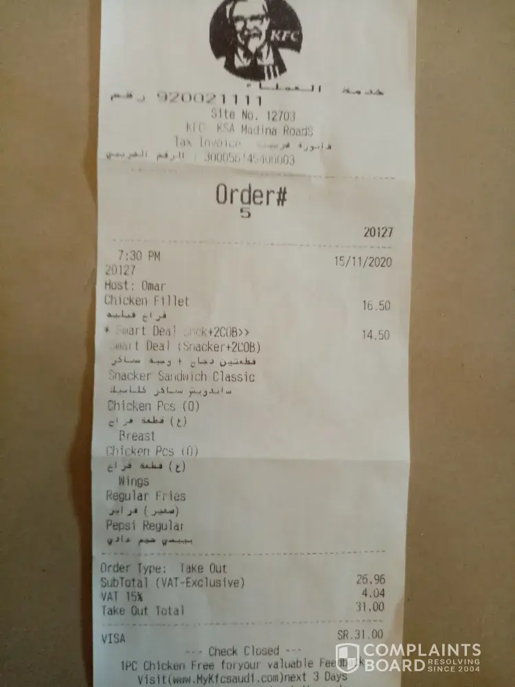 This is my second visit to this branch. I usually buy at the KFC on Prince Sultan Road and have always got finger licking good chicken.