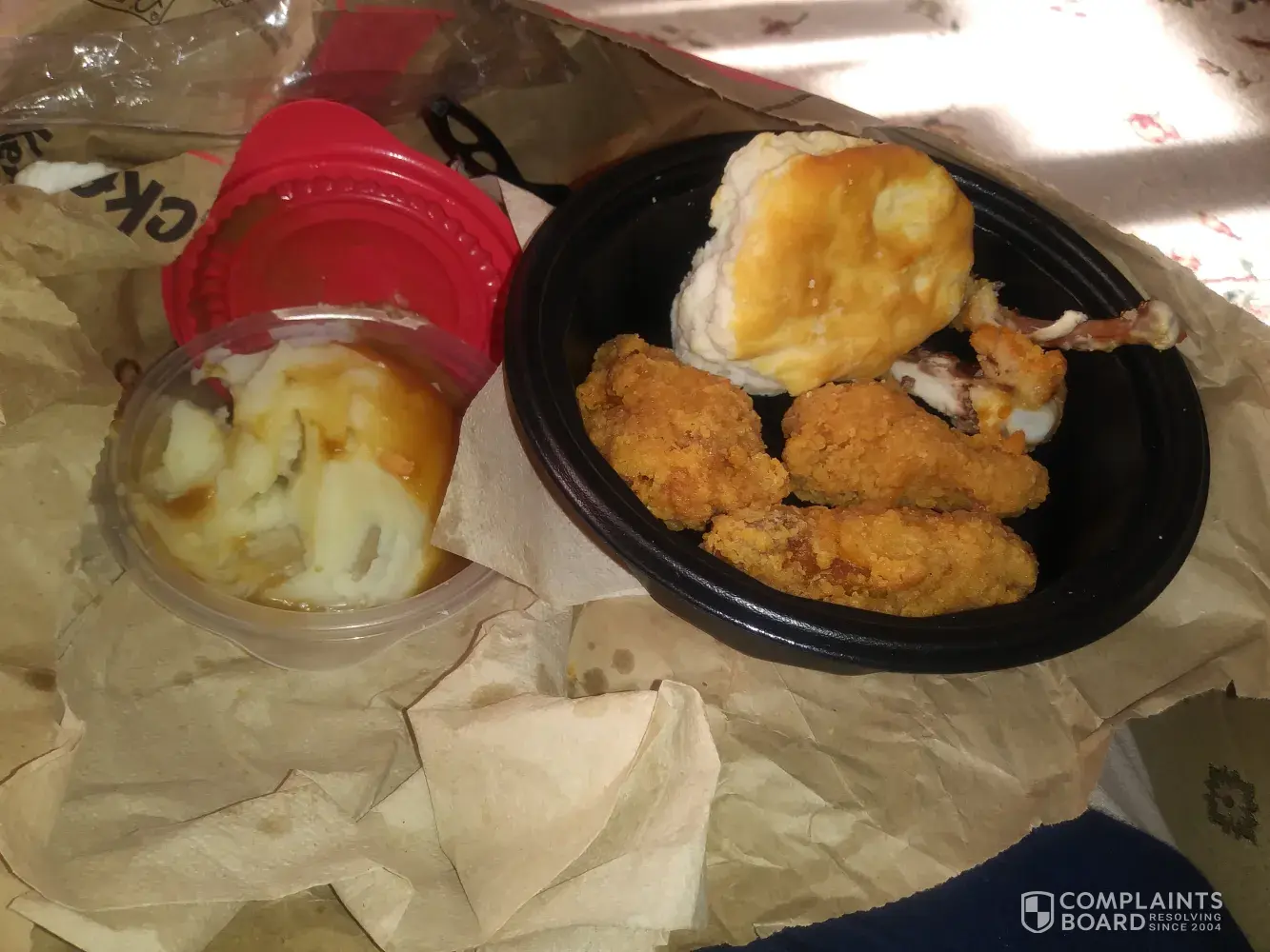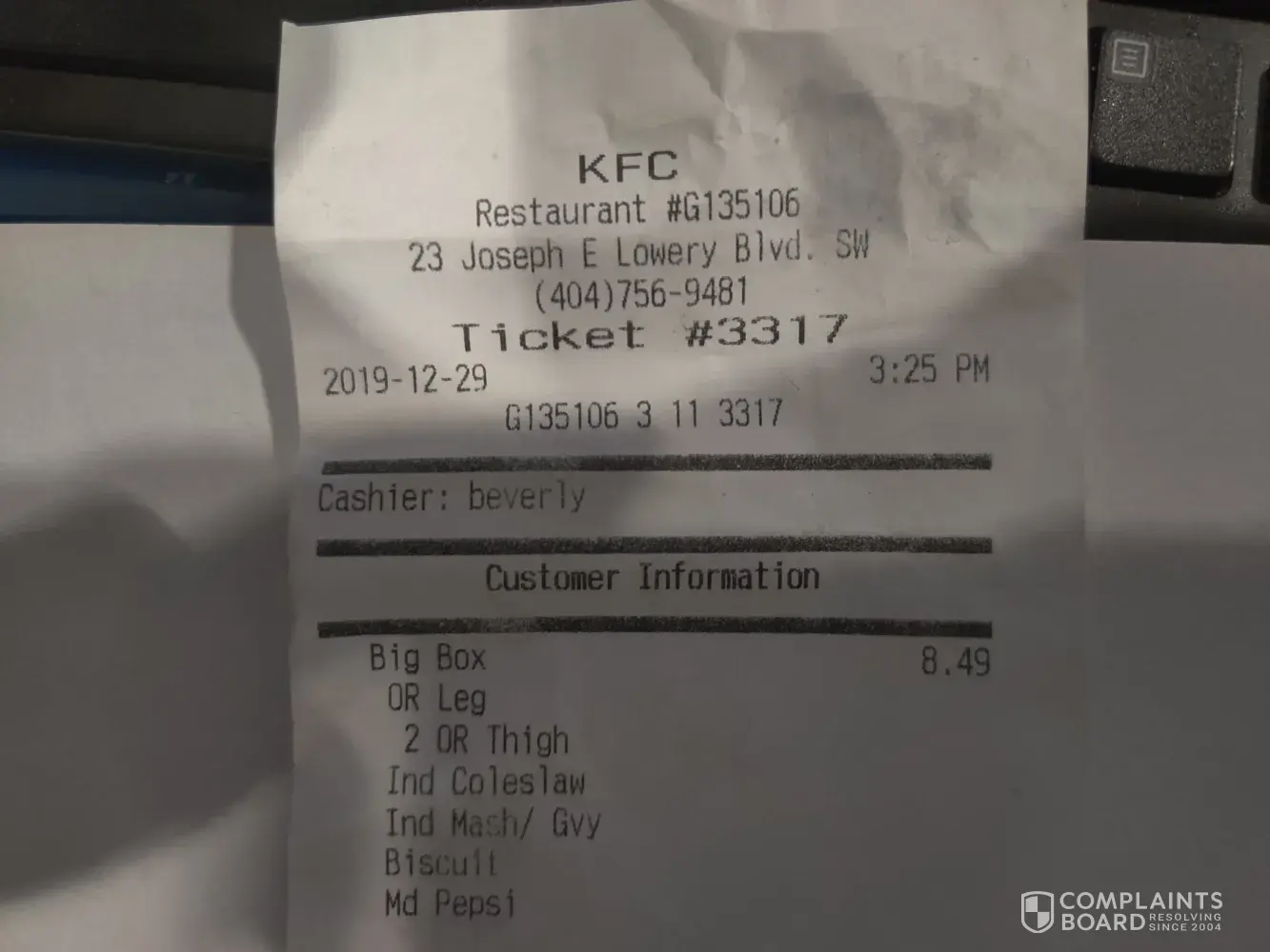 I got my KFC ticket number # 3317 at 3:25 p.m. on 12 /29 /2019 I ordered a number six big box with three pieces with coleslaw and mashed potatoes and gravy cost with tax $9.25 I got chicken that was overcooked and dry. I received a leg, a thigh and a breast when I should have received two thighs and a leg my sides were mashed potatoes and gravy and coleslaw the mashed potatoes had no gravy I called the store to file a complaint I was told that the number 6 big box only came with two pieces of chicken and not three so they would not be able to exchange my order but offered me some new sides I told him I was filing a complaint and they hung up the phone my name is Joseph Clark I am a loyal KFC customer and was disappointed in how the situation was handled I would like a refund or replacement meal [protected] email [protected]@gmail.com