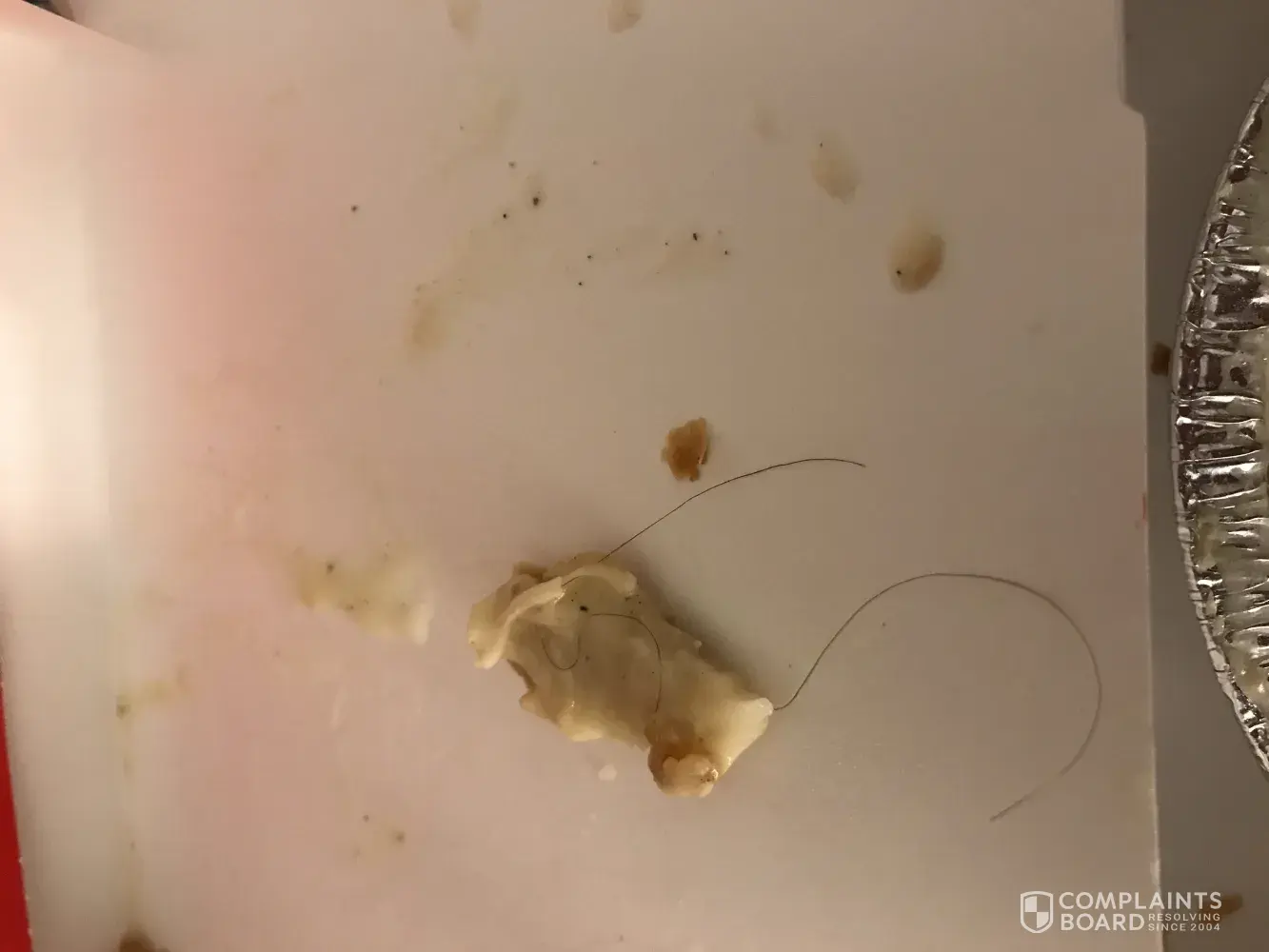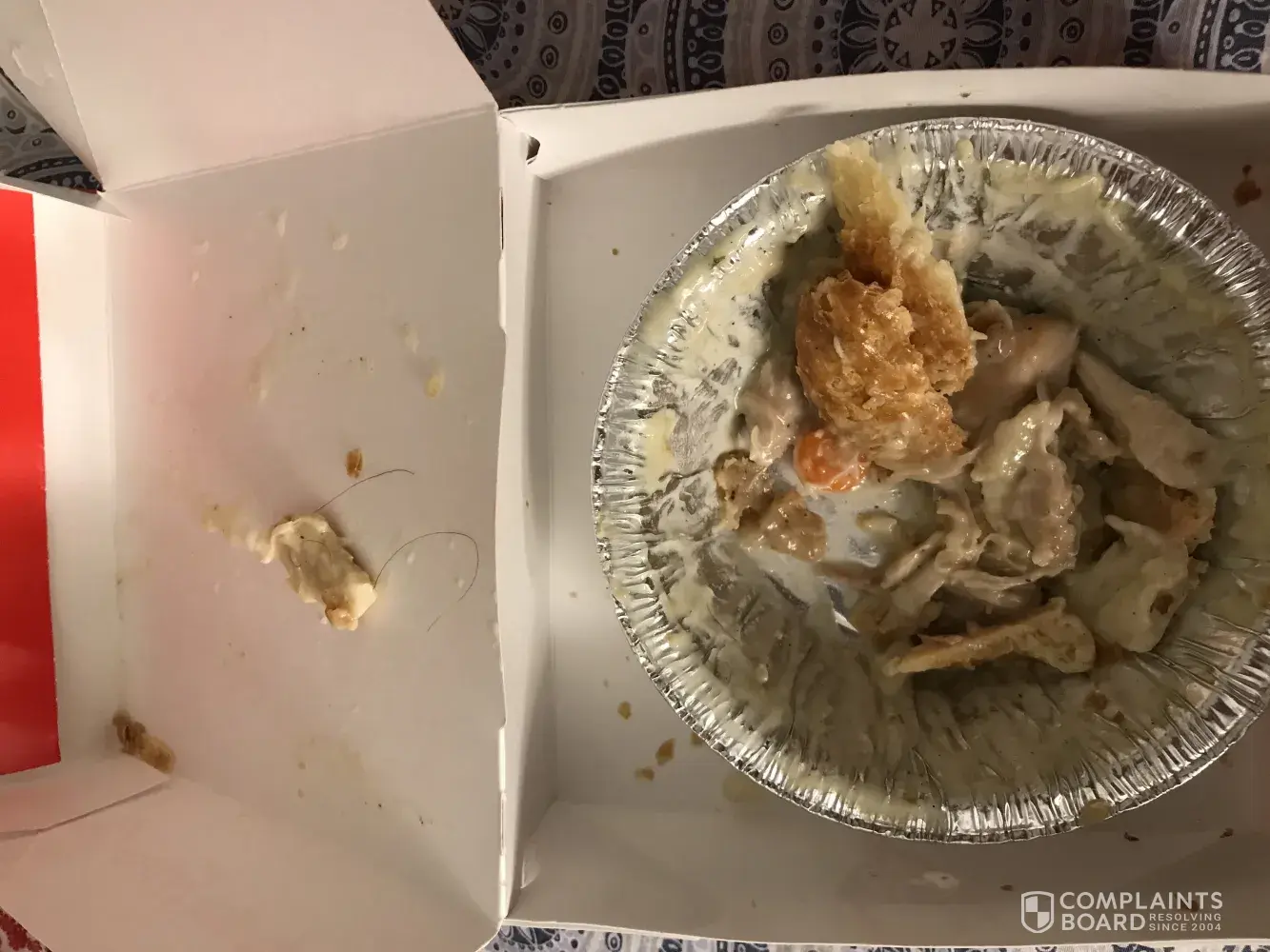 At 11:00 Am I picked up my Order of Potpie, chicken sandwhich, large coleslaw, large gravy, large mash potato and gravy My order number 2320 I went home, while eating my KFC Potpie I found a long black human hair which was really disgusting!🤢🤢🤢 It made me throw up and immediately I felt a strong headache that lasted for a while. I was unable to...