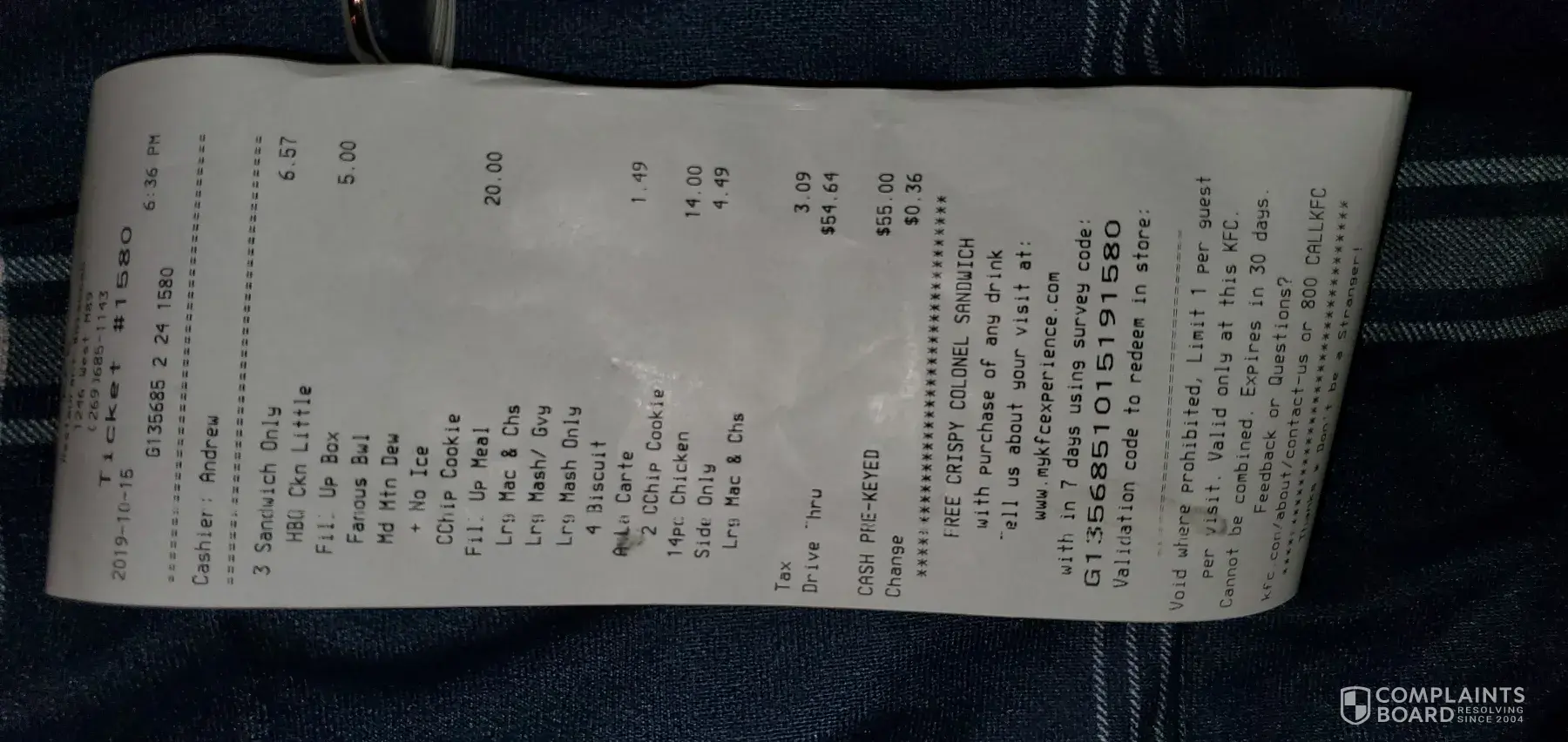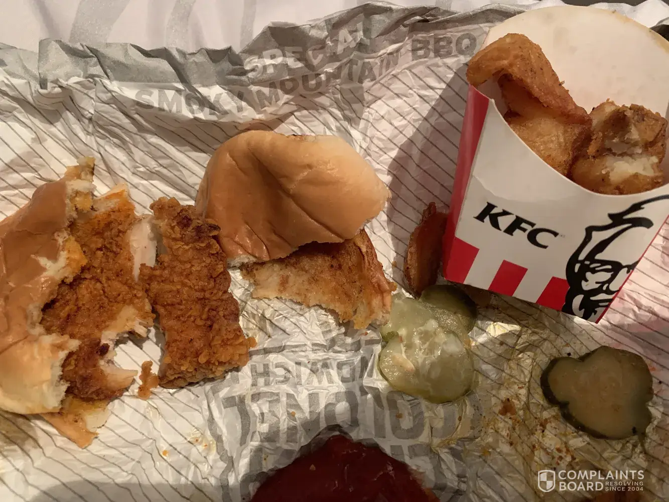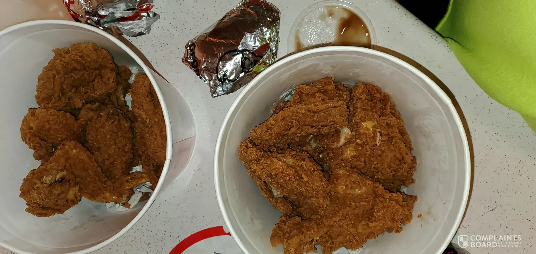 I spent $55 tonight. Both large buckets of chicken hat old dry dark chicken. They claimed to be out of biscuits. Offered cookies as replacement. Mac and cheese very mushy. KFC Bowl, chicken pieces were hard as Pebbles. Overall disgusting! First time ever having horrible food. Sandwiches flat squashed dry chicken. Claimed to be out of two different sauce...