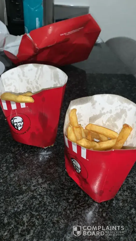 Drive thru order was wrong when we came to collection window, they fixed it there but as a result, our food was disgusting! Oily, not tasty, nor property packaged which led to half of our food landing outside of their packaging and in the packet. Quantities inconsistent, chips and pops only half way full, AND chicken pieces OILY! Have a look at the photo's and make your own judgement. I literally had to drip the oil down from the chicken pieces. So much oil it landed on the car seat and on my jeans. We have only been to this store thrice- and all three times something went wrong... I' m taking my business elsewhere. Needless to say, my dogs had kfc for dinner...