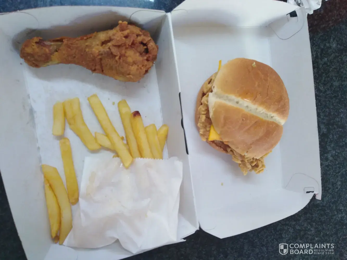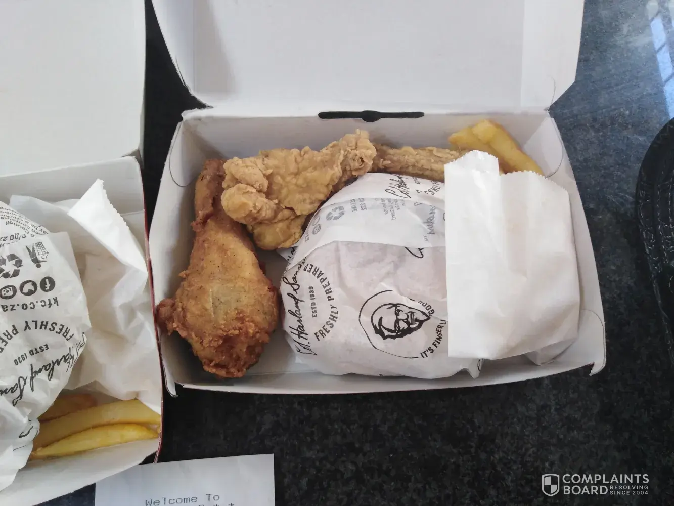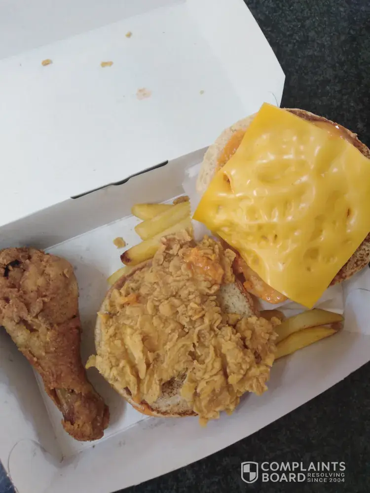 We decided to go back to KFC Protea Heights, as their drive through was working, it was just the soda machine that was out of order. We waited for an HOUR in the drive through before we got our food. Not because they were busy, but because everything was so slow. I mean, a drive through is supposed to be fast but the people inside of the restaurant got their food before the people in the drive through. We ordered two fully loaded box meals, and the Colonel burger was more bread than anything else.