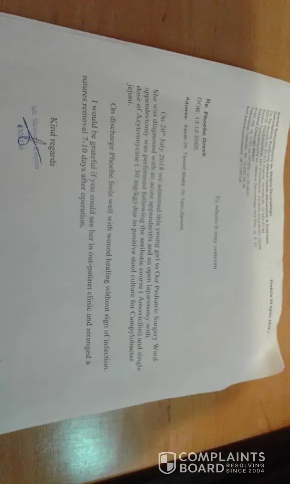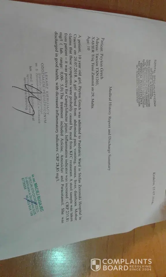 3 days after on thursday 19th july late evening, both of them was admitted to zeromski hospital in krakow with high fever and abdomen pain. Several tests were taken and the results was that they had campylobacter jejuni... Food poison caused from chicken. My eldest daughter was weaker the her sister because she had ate all her 3 pcs of chicken and she needed to be operated as well cause the bacteria has inflammated her appendix :- (we lost our flight on saturday 21st as the girls were till in hospital for treatment and very weak. My husband and I ended up sleeping at hospital with the luggages as were were then without accomodation (homeless) as our apartment was booked till saturday 21st. The girls were out of hospital on wednesday 25th july afternoon and fortunately we found a hotel until our flight back to malta. It wasn't east to find an acomodation and a flight back as it was peak season. I have all the documents from hospital and even the sanity report. Your chicken has riuned our 1st family holiday as it was my daughters first time abroad and they were really looking forward. We ended up staying 2weeks in krakow instead of 1week and most of it we were in hospital or recovering in the hotel. We flew back to malta last saturday 28th july and the girls are still weak to ejoy their summer holidays or even swim this summer. My eldest daughter will have a big mark on her tummy for the rest of her life. I would like a compensation for all this cause it's not fair. Kfc should be responsible for his food espacially when it comes from chicken.in krakow there are so many kfc's and I really hope no other patients were sick like my daughters. It's really scary cause it could have been fatal! You should take your responsability regarding this issue. I'm sorry to say but I would never trust your chicken again... It was a real nightmare have 2 kids dead sick in 2 different wards and far away from you home country. Attached you will find some photos of the hospital documents that show that both girls had camplobacter after eating kfc chicken. Wiating for your reply.