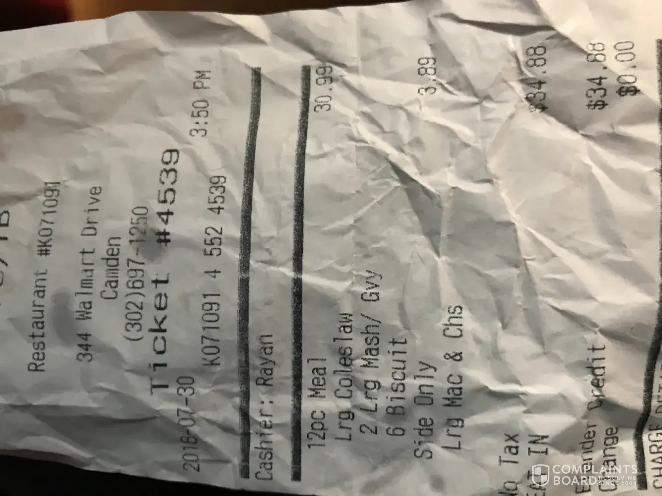 On july 31st, 2018... We placed a order to go...8 piece bucket.. Wanted potato wedges... But oh no.. Mashed and cole slaw only.. Who the hell wants mashed.. Especially in the middle of summer...? Now lets get to the chicken.. We received 4 chicken wings... Which consisted of... Bone and and the crispy coating...2 drum sticks...2 thighs.. I feel that we were totally ripped off... And this was'nt the first time we have been ripped off... The 2 other times consisted of...4 missing cookies... And no gravy for the mashed potatos that we had to get... Done with kfc... Thanks for not caring about the customer. I feel there should be some sort of compensation...