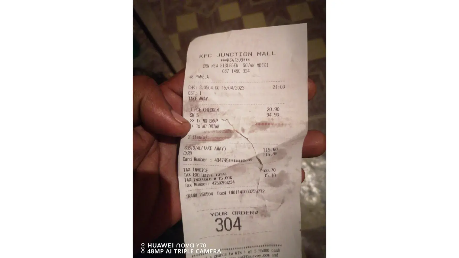 Bought a 6 piece at KFC Philippi Junction. The pieces were 4 dry pieces and 2 drumsticks that's not of concern for now..The quality of the chicken is not up to standard as it dry or if I must say over crispy,how disappointing gone my appetite! 15 April 2023 at 21h00 at Philippi Junction Mall