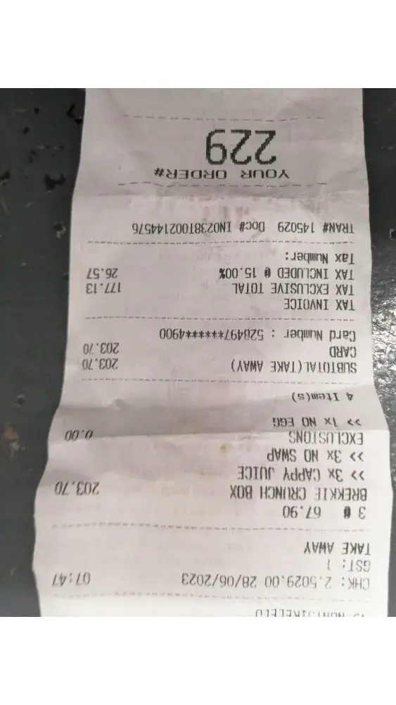 On the 28th June 2023 around 08:00 am I purchased 3 Brekkie box meals of which the chicken was raw.