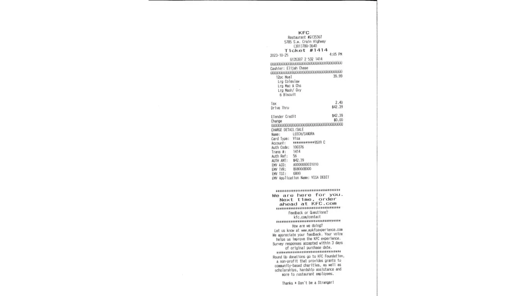 Receipt # G135307 2 532 1414 Cashier Elijah Chase