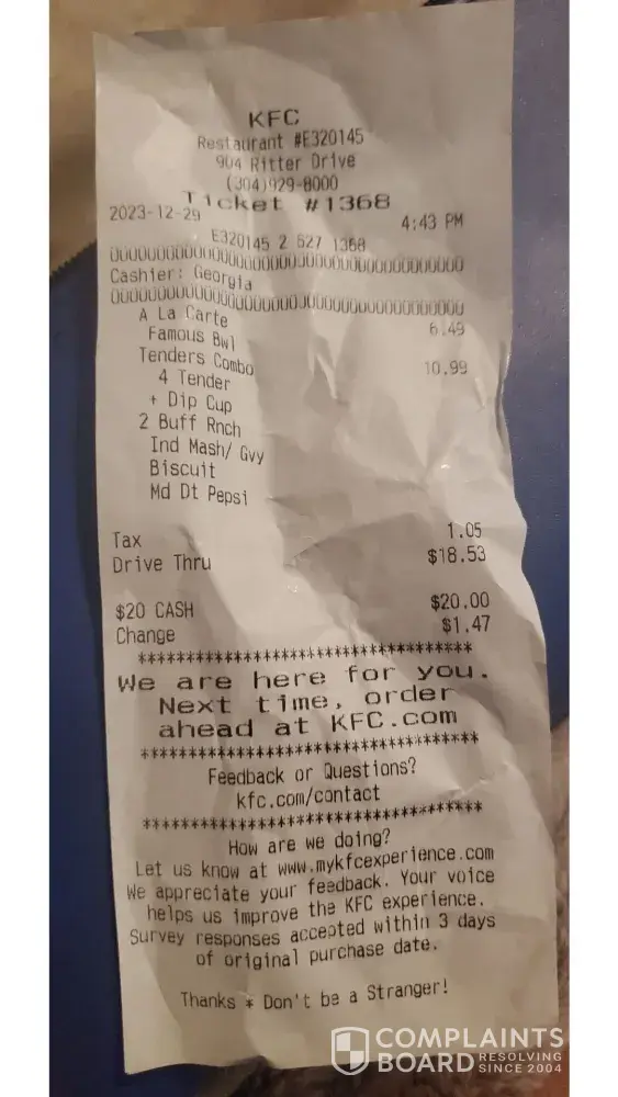 kfc in bangor maine gave me a incorrect order. went back to the store and was not treared very well by managment. my ticket number is 1452. would like someone to reach out to me asap. phone number is [protected]. thank you.