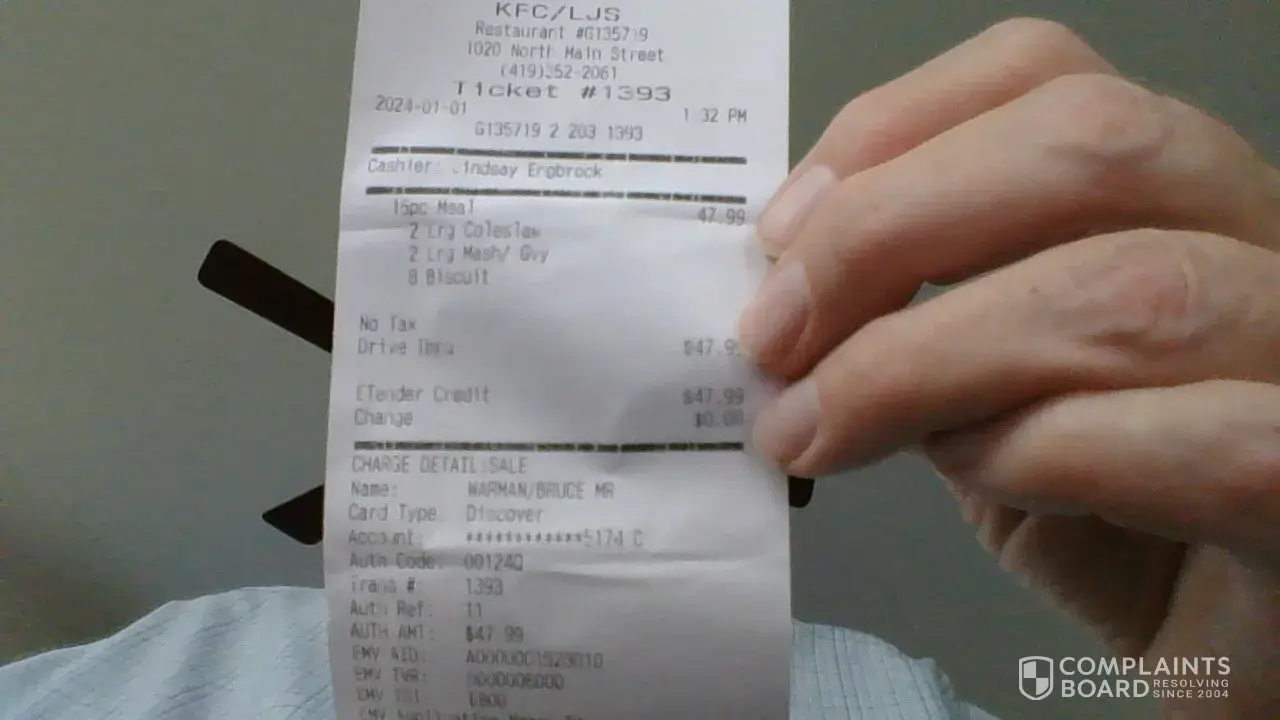 i purchased a 8 piece family meal on saturday. i asked for original chicken. when i got home. we found out it was extra cripsy. i called the restaurant #h45011 and talked to the manager and she said there was nothing she could do. unless i brought the chicken back. i am very upset. october 7 2023. ticket #1510