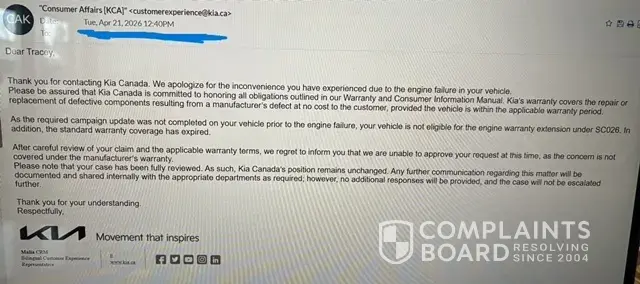My initial call to Kia Canada on April 21, 2026, at approximately 11:19 a.m., was to inquire about goodwill assistance, as recommended by a licensed mechanic following a catastrophic engine failure. The failure was attributed to a connecting rod bearing issue, which is a well-documented concern in vehicles equipped with the 2.4L Theta II engine. During this call, I spoke with David in Newfoundland, who was professional, helpful, and understanding.
