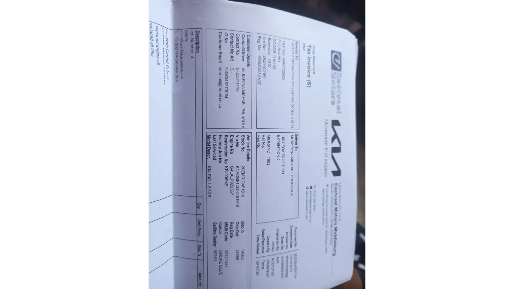 I was advised by a sales lady in Middleburg that if I buy my Kia Rio in will be under free service plan until it reaches 60000km, however today I took it for service at Kia centurion where I was forced to pay R3236. 00 which I had not budgeted for because my car is now on 45000km and I was under the impression that I don't have to pay for this service as per the agreement when I bought the car, please assist.