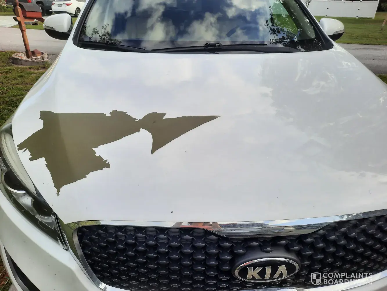 On 10/28/21 our 2016 Kia Sorento hood paint started to suddenly peel in very large pieces. This happened without any warning while my husband was driving in rain, as the pieces peeled off they stuck to the windshield and caused a significant driving hazard. This is evidence of a clear failure of the factory paint to properly stay adherred to the body of the car. We have reached out to Kia consumer resources both online and directly by phone, and have simply been told that there is nothing that can be done since the car is over 36, 000 miles. We have filed a complaint report with the National Highway Traffic Safety Administration.