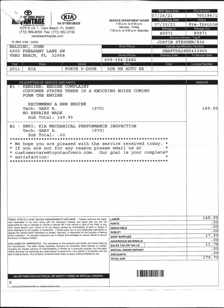 In May we purchased a 2013 KIA Sorento from Advantage Auto in Littleton, MA. This vehicle was sold with the understanding it has a "New" engine supplied and installed by KIA as a warranty issue with the previous owner.