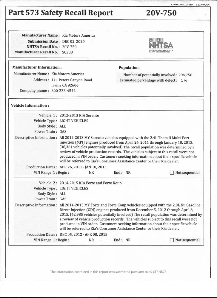 At about 90k miles, my daughters newly-acquired Kia Forte started making a grinding sound when accelerating. Mechanic and dealership have diagnosed the problem as an engine issue that requires a completely new engine--cost over $5K. Mechanic noted that the engine in my Kia is the same engine recalled in the NHTSA Recall No. 20V-750, manufacturer recall SC200. If Kia covered an engine replacement for those models with the same engine, should not this engine also be covered by KIA?